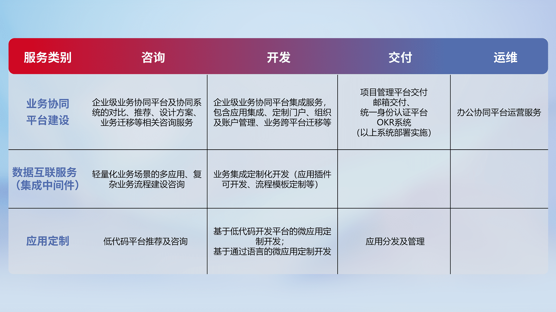 针对钉钉、、、、企微、、IDaas等平台级产品提供产品的规划、、、、方案、、、交付、、、定制化开发等服务,,,实现如统一协同办公、、、、智能客户服务、、、混合会议管理、、、智能数据查询、、、、等业务场景,,,,实现数字化转型。。。。